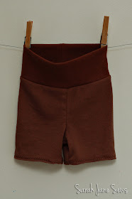 While she will mostly wear this with some pink and white striped capri leggings that she already has, I also wanted some brown undershorts for when it's too warm for capris. I traced Jalie 2796 for that purpose last year and never got around to making any, so I was all set to make a quick pair. She has a super tiny waist and butt, so they are a size F for the width (and length, not sure what past Sarah was thinking on that -- they're quite short!) and size I for the rise. When I finished, they looked impossibly small, but they're actually a perfect fit, other than the leg length. They do cover her diaper, though, which was my main goal. I'll lengthen the legs quite a bit for more modesty in the future, though.